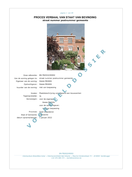 Een plaatsbeschrijving kan gemaakt worden in functie van geplande bouwwerken bij de buren of in functie van verhuur. Het is een document dat wordt ondertekend door de belanghebbenden waarop deze in een eventueel conflict kunnen terugvallen. Een plaatsbeschrijving van een doorsnee woning (B 6m x D 8m x H 10m) kost 480€ incl btw. Gelieve contact op te nemen voor andere gebouwen.
